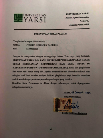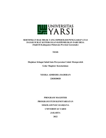 Baderan, Yesika Adhisdea (2022) SERTIFIKAT HAK MILIK YANG DIPEROLEH PENGGARAP ATAS DASAR SURAT KETERANGAN KEPEMILIKAN DARI DESA (Studi Di Kabupaten Pohuwato Provinsi Gorontalo). Masters thesis, Universitas YARSI.