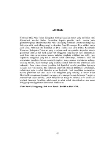 Sertifikat Hak Atas Tanah merupakan bukti penguasaan tanah yang diberikan oleh Pemerintah melalui Badan Pertanahan kepada pemilik tanah, namun pada perkembanganya ada sertifikat Hak Atas Tanah yang diberikan kepada sesorang yang bukan pemilik tanah (Penggarap) berdasarkan Surat Keterangan Kepemilikan tanah dari Desa. Penelitian ini dilakukan di Desa Marisa dan Desa Bunto, Kecamatan Popayato, Kabupaten Pohuwato yang bertujuan untuk menganalisis kepastian hukum perolehan sertifikat hak milik tanah oleh penggarap yang didasari surat kepemilikan dari desa, serta penyelesaian hukum terhadap sengketa sertifikat hak milik yang diperoleh penggarap yang bukan pemilik tanah sebenarnya. Penelitian Tesis ini merupakan penelitian hukum normatif-empiris, menggunakan pendekatan undang-undang, historis, dan Sosiologis yang dilakukan untuk meneliti data primer dan data sekunder. Data primer dalam penelitian ini diperoleh melalui penelitian lapangan dengan cara wawancara, data sekunder diperoleh melalui penelitian kepustakaan, selanjutnya data tersebut dianalisa secara kualitatif. Hasil penelitian menunjukan bahwa perolehan hak atas tanah oleh penggarap yang tertuang di dalam Surat Kepemilikan tanah dari desa tidak mempunyai keterangan bahwa dari mana Penggarap memperoleh tanah tersebut. Untuk Penyelesaian Sengketa tersebut harus dilakukan melalui Lembaga Peradilan, sebab tanah tersebut sudah disertifikatkan atas nama Penggarap sehingga harus dimintakan pembatalan.