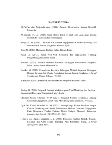 Penelitian ini bertujuan untuk mengetahui ada tidaknya pengaruh pemasaran konten, citra merek terhadap pembelian berulang melalui keterikatan pelanggan sebagai mediasi pada konsumen produk fashion Uniqlo di DKI Jakarta serta tinjauannya dari sudut pandang Islam. Populasi penelitian ini merupakan konsumen produk fashion Uniqlo. Sampel dalam penelitian ini ialah konsumen yang pernah melakukan kunjungan dan membeli produk lebih dari 2 kali di Uniqlo dengan jumlah sampel 100 responden. Teknik pengambilan sampel menggunakan metode non probability sampling, dengan teknik purposive sampling melalui penyebaran kuesioner. Metode analisis data dilakukan dengan Partial Least Square Structural Equation Modeling (PLS-SEM) melalui program WarpPls 8.0. Hasil penelitian menunjukkan bahwa Pemasaran konten berpengaruh positif dan signifikan terhadap Pembelian Berulang. Citra merek berpengaruh positif dan signifikan terhadap pembelian Berulang. Keterikatan Pelanggan berpengaruh Positif dan Signifikan terhadap Pembelian Berulang. Pemasaran Konten berpengaruh Positif dan Signifikan terhadap Keterikatan Pelanggan. Citra Merek masing-masing berpengaruh Positif dan Signifikan terhadap Keterikatan Pelanggan (p-value < 0,05). Keterikatan Pelanggan Mampu Memediasi Pengaruh Pemasaran Konten Terhadap Pembelian Berulang (p-value 0,036). Keterikatan Pelanggan Mampu Memediasi Pengaruh Citra Merek Terhadap Pembelian Berulang (p-value 0,027). Pemasaran konten, citra merek, pembelian berulang dan keterikatan pelanggan pada konsumen produk fashion Uniqlo sudah dilakukan sesuai dengan prinsip-prinsip Islam.