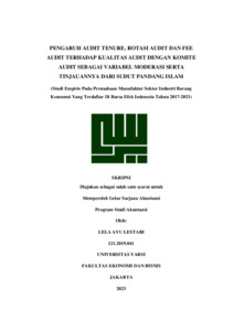 Penelitian ini bertujuan untuk menguji Pengaruh audit tenure, rotasi audit, fee audit Terhadap kualitas audit Dengan komite audit Sebagai Variabel Moderasi. Penelitian ini menggunakan populasi perusahaan Manufaktur Sektor Industri Barang Konsumsi yang terdaftar di Bursa Efek Indonesia (BEI) tahun 2017-2021. Teknik pengambilan sampel dalam penelitian ini adalah purposive sampling dan didapat sampel 38 perusahaan. Penelitian ini menggunakan data sekunder yaitu laporan keuangan tahunan yang diperoleh dari situs resmi Indonesia Stock Exchange (IDX). Metode analisis yang digunakan adalah regresi logistik dengan aplikasi SPSS versi 29.0. Hasil penelitian menunjukan bahwa audit tenure dan rotasi tidak berpengaruh terhadap kualitas audit sedangkan fee audit berpengaruh terhadap kualitas audit. Komite audit tidak mampu memoderasi pengaruh rotasi audit terhadap kualitas audit, Komite audit mampu memoderasi pengaruh audit tenure dan fee audit terhadap kualitas audit. Serta secara keseluruhan dalam perspektif Islam bahwa semua variabel terkait sudah memenuhi syariat Islam sebagaimana yang tertuang dalam Al-Quran dan Hadist.
