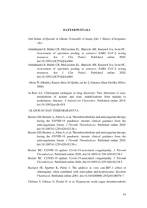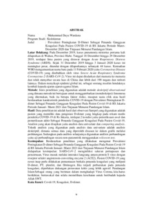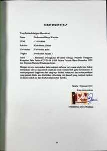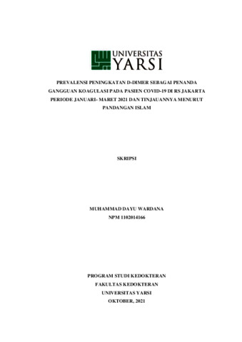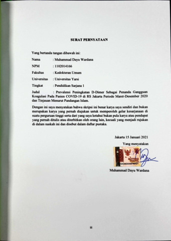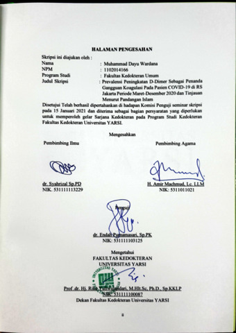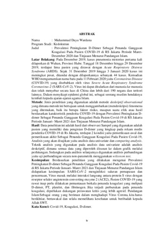 Latar Belakang: Pada Desember 2019, kasus pneumonia misterius pertama kali dilaporkan di Wuhan, Provinsi Hube. Tanggal 18 Desember hingga 29 Desember 2019, terdapat lima pasien yang dirawat dengan Acute Respiratory Distress Syndrome (ARDS). Sejak 31 Desember 2019 hingga 3 Januari 2020 kasus ini meningkat pesat, ditandai dengan dilaporkannya sebanyak 44 kasus. Kemudian WHO mengumumkan nama baru pada 11 Februari 2020 yaitu Coronavirus Disease (COVID-19) yang disebabkan oleh virus Severe Acute Respiratory Syndrome Coronavirus-2 (SARS-CoV-2). Virus ini dapat ditularkan dari manusia ke manusia dan telah menyebar secara luas di China dan lebih dari 190 negara dan teritori lainnya. Dalam menyikapi epidemi global ini, sebagai seorang muslim hendaknya kembali kepada ajaran-ajaran agama Islam. Metode: Jenis penelitian yang digunakan adalah metode deskriptif observational yang dimana metode ini bertujuan untuk menggambarkan (mendeskripsi) fenomena yang ditemukan, baik itu berupa faktor risiko, maupun suatu efek atau hasil berdasarkan karakteristik penderita COVID-19 dengan Prevalensi Peningkatan D-dimer Sebagai Penanda Gangguan Koagulasi Pada Pasien Covid-19 di RS Jakarta Periode Januari- Maret 2021 dan Tinjauan Menurut Pandangan Islam. Hasil: Data penelitian ini adalah hasil dari observasi Sampel yang digunakan adalah pasien yang memiliki data pengisian D-dimer yang lengkap pada rekam medis penderita COVID-19 di Rs Jakarta, terdapat 2 kondisi yaitu pemeriksaan awal dan pemeriksaan akhir Sebagai Penanda Gangguan Koagulasi Pada Pasien Covid-19, Analisis yang akan disajikan yaitu analisis data univariate dan comparing analysis. Teknik analisis yang digunakan pada analisis data univariate adalah analisis deskriptif, dimana semua data yang diperoleh disusun ke dalam grafik melalui perhitungan. Sedangkan pada análisis selanjutnya digunakan análisis perbandingan yaitu uji perbandingan secara non-parametrik menggunakan wilcoxon test. Kesimpulan: Berdasarkan penelitian yang dilakukan mengenai Prevalensi Peningkatan D-dimer Sebagai Penanda Gangguan Koagulasi Pada Pasien Covid-19 di RS Jakarta Periode Januari- Maret 2021 dan Tinjauan Menurut Pandangan Islam didapatkan kesimpulan: SARS-CoV-2 menginfeksi saluran pernapasan dan pencernaan, Virus masuk melalui interaksi langsung antara protein S virus dengan reseptor seluler angiotensin-converting enzyme 2 (ACE2), Pasien COVID-19 yang rawat inap perlu dilakukan pemantauan berkala penanda koagulasi yang meliputi D-dimer, PT, platelet, dan fibrinogen. Jika terjadi perburukan pada penanda koagulasi, diperlukan dukungan perawatan kritis yang lebih agresif. Pandangan Islam Sebagai orang yang beriman dalam menghadapi Virus Corona, kita harus berikhtiar, bertawakal dan selalu memelihara kesehatan untuk beribadah kepada Allah SWT.