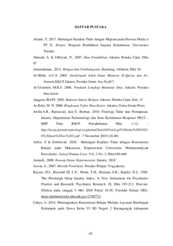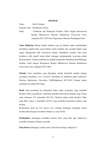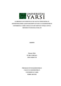 Cempaka, Putri (2021) GAMBARAN DAN HUBUNGAN KUALITAS TIDUR DENGAN KONSENTRASI BELAJAR MAHASISWA/I FAKULTAS KEDOKTERAN UNIVERSITAS YARSI ANGKATAN 2017-2019 DAN TINJAUANNYA MENURUT PANDANGAN ISLAM. Diploma thesis, Universitas YARSI.