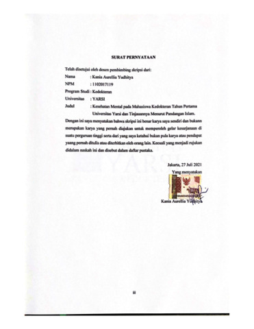 Yudhitya, Kania Aurellia (2021) KESEHATAN MENTAL PADA MAHASISWA KEDOKTERAN TAHUN PERTAMA UNIVERSITAS YARSI DAN TINJAUANNYA MENURUT PANDANGAN ISLAM. Diploma thesis, Universitas YARSI.