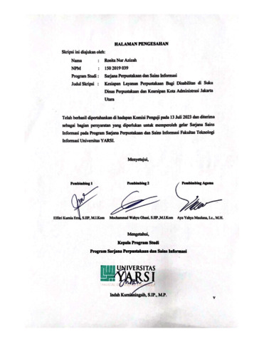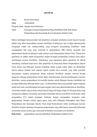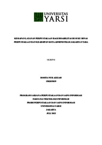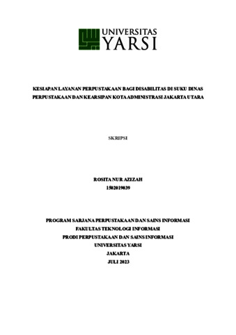 Azizah, Rosita Nur (2023) KESIAPAN LAYANAN PERPUSTAKAAN BAGI DISABILITAS DI SUKU DINAS PERPUSTAKAAN DAN KEARSIPAN KOTA ADMINISTRASI JAKARTA UTARA. Diploma thesis, Universitas YARSI.