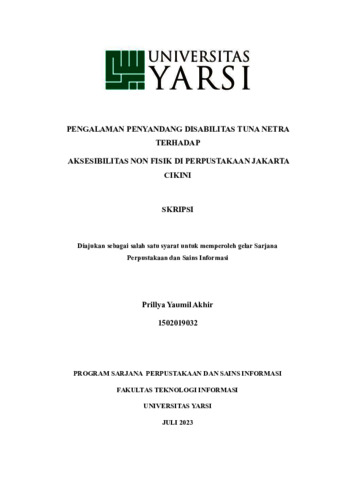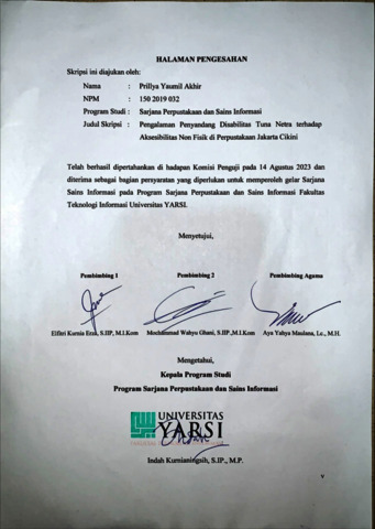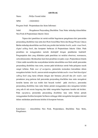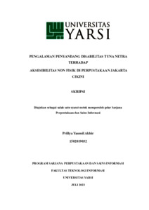 Akhir, Prillya Yaumil (2023) PENGALAMAN PENYANDANG DISABILITAS TUNA NETRA TERHADAP AKSESIBILITAS NON FISIK DI PERPUSTAKAAN JAKARTA CIKINI. Diploma thesis, Universitas YARSI.