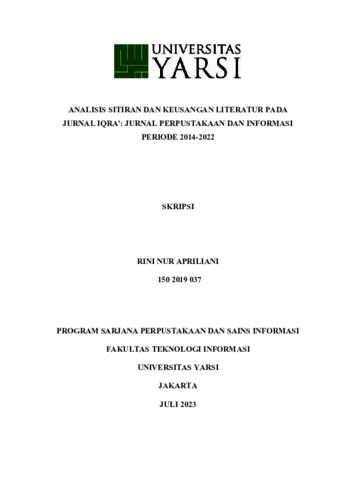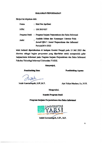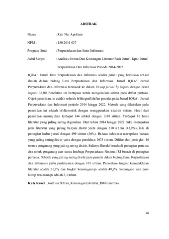 Apriliani, Rini Nur (2023) ANALISIS SITIRAN DAN KEUSANGAN LITERATUR PADA JURNAL IQRA': JURNAL PERPUSTAKAAN DAN INFORMASI PERIODE 2014-2022. Diploma thesis, Universitas YARSI.