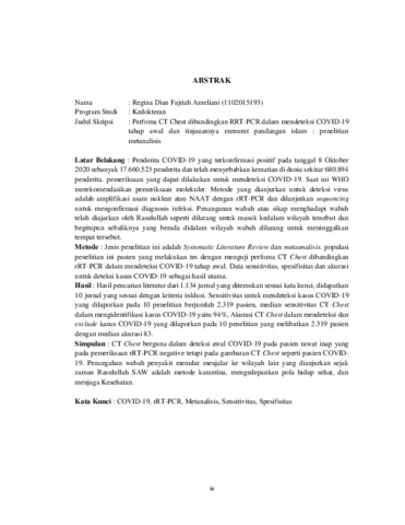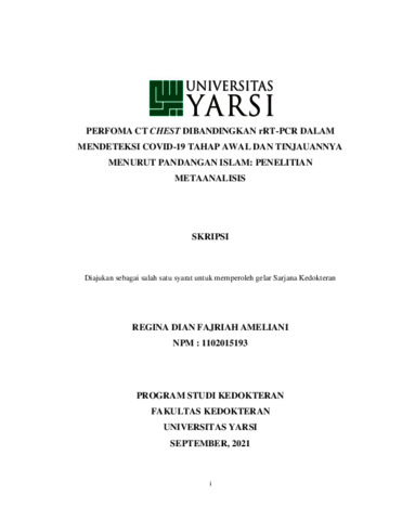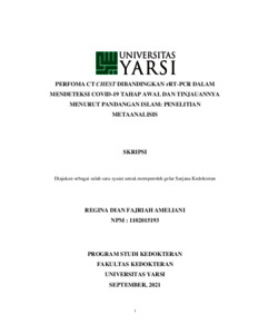 Ameliani, Regina Dian Fajriah (2021) PERFOMA CT CHEST DIBANDINGKAN rRT-PCR DALAM MENDETEKSI COVID-19 TAHAP AWAL DAN TINJAUANNYA MENURUT PANDANGAN ISLAM: PENELITIAN METAANALISIS. Diploma thesis, Universitas YARSI.