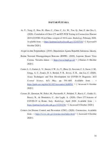 11. BAB V PERFOMA CT CHEST DIBANDINGKAN rRT-PCR DALAM MENDETEKSI.pdf Restricted to Registered users only Download (299kB) |