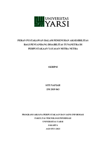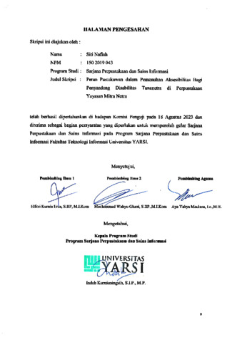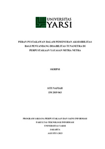 Nafiah, Siti (2023) PERAN PUSTAKAWAN DALAM PEMENUHAN AKSESIBILITAS BAGI PENYANDANG DISABILITAS TUNANETRA DI PERPUSTAKAAN YAYASAN MITRA NETRA. Diploma thesis, Universitas YARSI.