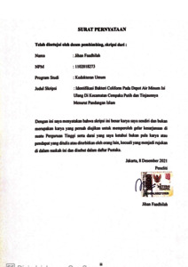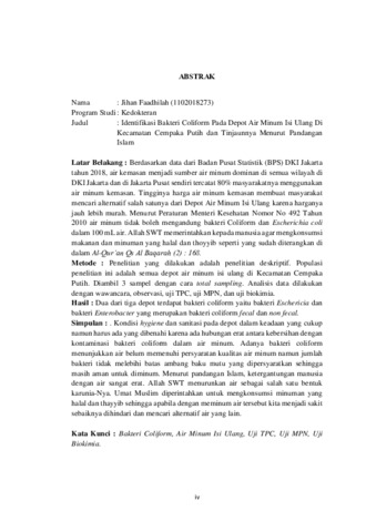 Latar Belakang : Berdasarkan data dari Badan Pusat Statistik (BPS) DKI Jakarta tahun 2018, air kemasan menjadi sumber air minum dominan di semua wilayah di DKI Jakarta dan di Jakarta Pusat sendiri tercatat 80% masyarakatnya menggunakan air minum kemasan. Tingginya harga air minum kemasan membuat masyarakat mencari alternatif salah satunya dari Depot Air Minum Isi Ulang karena harganya jauh lebih murah. Menurut Peraturan Menteri Kesehatan Nomor No 492 Tahun 2010 air minum tidak boleh mengandung bakteri Coliform dan Escherichia coli dalam 100 mL air. Allah SWT memerintahkan kepada manusia agar mengkonsumsi makanan dan minuman yang halal dan thoyyib seperti yang sudah diterangkan di dalam Al-Qur’an Qs Al Baqarah (2) : 168. Metode : Penelitian yang dilakukan adalah penelitian deskriptif. Populasi penelitian ini adalah semua depot air minum isi ulang di Kecamatan Cempaka Putih. Diambil 3 sampel dengan cara total sampling. Analisis data dilakukan dengan wawancara, observasi, uji TPC, uji MPN, dan uji biokimia. Hasil : Dua dari tiga depot terdapat bakteri coliform yaitu bakteri Eschericia dan bakteri Enterobacter yang merupakan bakteri coliform fecal dan non fecal. Simpulan : . Kondisi hygiene dan sanitasi pada depot dalam keadaan yang cukup namun harus ada yang dibenahi karena ada hubungan erat antara kebersihan dengan kontaminasi bakteri coliform dalam air minum. Adanya bakteri coliform menunjukkan air belum memenuhi persyaratan kualitas air minum namun jumlah bakteri tidak melebihi batas ambang baku mutu yang dipersyaratkan sehingga masih aman untuk diminum. Menurut pandangan Islam, ketergantungan manusia dengan air sangat erat. Allah SWT menurunkan air sebagai salah satu bentuk karunia-Nya. Umat Muslim diperintahkan untuk mengkonsumsi minuman yang halal dan thayyib sehingga apabila dengan meminum air tersebut kita menjadi sakit sebaiknya dihindari dan mencari alternatif air yang lain.