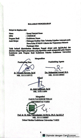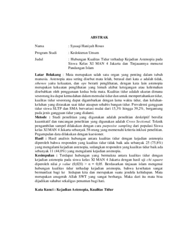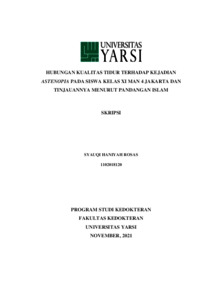 Rosas, Syauqi Haniyah (2021) HUBUNGAN KUALITAS TIDUR TERHADAP KEJADIAN ASTENOPIA PADA SISWA KELAS XI MAN 4 JAKARTA DAN TINJAUANNYA MENURUT PANDANGAN ISLAM. Diploma thesis, Universitas YARSI.
