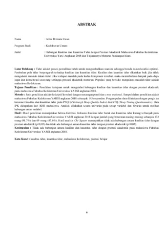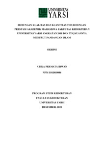 Irwan, Atika Permata (2021) HUBUNGAN KUALITAS DAN KUANTITAS TIDUR DENGAN PRESTASI AKADEMIK MAHASISWA FAKULTAS KEDOKTERAN UNIVERSITAS YARSI ANGKATAN 2018 DAN TINJAUANNYA MENURUT PANDANGAN ISLAM. Diploma thesis, Universitas YARSI.