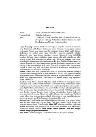 Latar Belakang : Demam tifoid masih merupakan penyakit endemik di Indonesia yang disebabkan oleh bakteri Salmonella typhi. Penyakit ini mengenai saluran pencernaan. Faktor yang mempengaruhi penularan demam tifoid adalah higiene lingkungan dan sanitasi yang buruk. Timbulnya resistensi antibiotik terhadap Salmonella typhi yang disebut multidrug resistant Salmonella typhi (MDRST) membuat berbagai upaya dilakukan untuk mencari alternatif antimikroba, salah satunya berasal dari tanaman atau bahan alam. Salah satu tanaman yang dapat dimanfaatkan sebagai pengobatan tradisional adalah daun Thai basil. Pada tanaman ini terdapat flavonoid yang dapat menghambat pertumbuhan bakteri dengan cara merusak dinding sel dan menonaktifkan kerja enzim. Thai basil merupakan jenis tanaman yang tumbuh di bumi yang telah disediakan Allah untuk kepentingan manusia dengan mengkonsumsi dan merasakan manfaatnya. Metode : Daun Thai basil (Ocimum basilicum var. thyrsiflora) diekstraksi dengan metode maserasi menggunakan pelarut etanol 96%. Ekstrak yang diperoleh dengan berbagai konsentrasi dilakukan uji aktivitas antibakteri dengan metode difusi. Kontrol positif yang digunakan adalah Ciprofloxacin dan kontrol negatif yang digunakan adalah DMSO 10% Hasil : Hasil uji Anova satu arah didapatkan nilai P <0.000 hal ini menunjukan bahwa pemberian daun Thai basil memberikan efek hambatan terhadap pertumbuhan bakteri yang bermakna. Hasil analisis data ekstrak daun Thai Basil, didapatkan perbedaan daya hambat pertumbuhan bakteri Salmonella typhi terhadap beberapa kelompok perlakuan. Pada penelitian ini dapat diketahui bahwa konsentrasi ekstrak 35.000 ppm memiliki zona hambat dengan diameter (mm) terbesar dibandingkan dengan kelompok konsentrasi ekstrak lainnya. Akan tetapi, efek antibakteri dari ekstrak daun Thai basil masih belum bisa menggantikan antibiotik Ciprofloxacin yang memiliki diameter (mm) zona hambat yang lebih besar dari ekstrak daun Thai basil. Kesimpulan : Penelitian ini dapat diketahui bahwa didapatkan zona hambat sedang pada berbagai konsentrasi ekstrak daun Thai basil namun masih belum bisa menggantikan antibiotic Ciprofloxacin. Allah SWT telah memberi kita akal untuk berpikir bagaimana cara memanfaatkan segala jenis tumbuhan yang didalamnya mempunyai banyak manfaat. Salah satunya adalah Tanaman Thai basil, dengan manfaat sebagai pengobatan antibakteri.