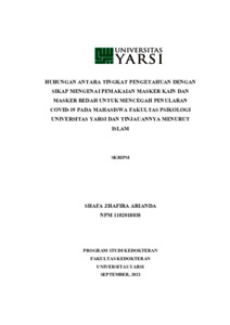 Arianda, Shafa Zhafira (2021) HUBUNGAN ANTARA TINGKAT PENGETAHUAN DENGAN SIKAP MENGENAI PEMAKAIAN MASKER KAIN DAN MASKER BEDAH UNTUK MENCEGAH PENULARAN COVID-19 PADA MAHASISWA FAKULTAS PSIKOLOGI UNIVERSITAS YARSI DAN TINJAUANNYA MENURUT ISLAM. Diploma thesis, Universitas YARSI.