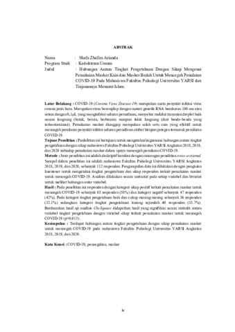 Latar Belakang : COVID-19 merupakan suatu penyakit infeksi virus corona jenis baru. Merupakan virus beramplop dengan materi generik RNA berukuran 100 nm yang menginfeksi saluran pernafasan, menyebar melalui transmisi droplet baik secara langsung (batuk, bersih, berbibaca) maupun tidak langsung (dari benda-benda yang terkontaminasi). Pemakaian masker dianggap merupakan salah satu cara yang efektif utuk mencegah penularan penyaki infeksi aluran pernafasan akibat hirupan patogen termasuk penularan COVID-19. Tujuan Penelitian : Penelitian ini bertujuan untuk mengetahui bagaimana hubungan antara tingkat pengetahuan dengan sikap mahasiswa Fakultas Psikologi Universitas YARSI Angkatan 2018, 2019, dan 2020 terhadap pemakaian masker dalam upaya mencegah penularan COVID-19. Metode : Jenis penelitian ini adalah deskriptif korelasi dengan rancangan penelitian cross sectional. Sampel dalam penelitian ini adalah mahasiswa Fakultas Psikologi Universitas YARSI Angkatan 2018, 2019, dan 2020, sebanyak 112 responden. Pengumpulan data ini dilakukan dengan pengisian kuesioner untuk mengetahui tingkat pengetahuan dan sikap responden terkait pemakaian masker untuk mencegah COVID-19. Analisis dilakukan secara univariat pada setiap variabel dan bivariat untuk melihat hubungan antar variabel. Hasil : Pada penelitian ini responden dengan kategori sikap positif terkait pemakaian masker untuk mencegah COVID-19 sebanyak 65 responden (58%) dan kategori negatif sebanyak 47 responden (42%). Pada kategori ringkat pengetahuan baik dan cukup masing-masing sebanyak 36 responden (32,1%) sedangkan jategori tingkat pengetahuan kurang sejumlah 40 responden (35,7%). Berdasarkan hasil uji analisis Chi-Square didapatkan hasil yang signifikan secara statistik antara variabeel sikap terkait pemakaian masker untuk mencegah COVID-19 (p=0,013). Kesimpulan : Terdapat hubungan antara tingkat pengetahuan dengan sikap pemakaian masker untuk mencegah COVID-19 pada mahasiswa Fakutas Psikologi Universitas YARSI Angkatan 2018, 2019, dan 2020.