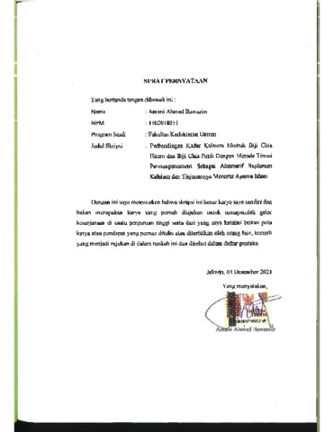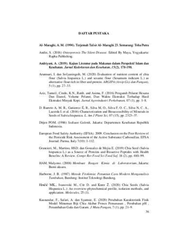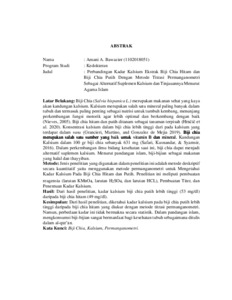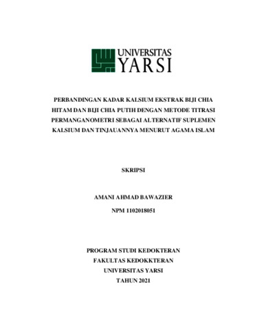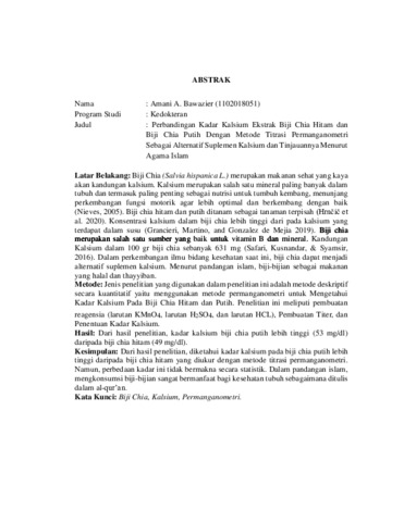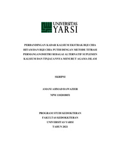 Latar Belakang Biji Chia (Salvia hispanica L.) merupakan makanan sehat yang kaya akan kandungan kalsium. Kalsium merupakan salah satu mineral paling banyak dalam tubuh dan termasuk paling penting sebagai nutrisi untuk tumbuh kembang, menunjang perkembangan fungsi motorik agar lebih optimal dan berkembang dengan baik (Nieves, 2005). Biji chia hitam dan putih ditanam sebagai tanaman terpisah (Hrnčič et al. 2020). Konsentrasi kalsium dalam biji chia lebih tinggi dari pada kalsium yang terdapat dalam susu (Grancieri, Martino, and Gonzalez de Mejia 2019). Biji chia merupakan salah satu sumber yang baik untuk vitamin B dan mineral. Kandungan Kalsium dalam 100 gr biji chia sebanyak 631 mg (Safari, Kusnandar, & Syamsir, 2016). Dalam perkembangan ilmu bidang kesehatan saat ini, biji chia dapat menjadi alternatif suplemen kalsium. Menurut pandangan islam, biji-bijian sebagai makanan yang halal dan thayyiban. Metode jenis penelitian yang digunakan dalam penelitian ini adalah metode deskriptif secara kuantitatif yaitu menggunakan metode permanganometri untuk Mengetahui Kadar Kalsium Pada Biji Chia Hitam dan Putih. Penelitian ini meliputi pembuatan reagensia (larutan KMnO4, larutan H2SO4, dan larutan HCL), Pembuatan Titer, dan Penentuan Kadar Kalsium. Hasil dari hasil penelitian, kadar kalsium biji chia putih lebih tinggi (53 mg/dl) daripada biji chia hitam (49 mg/dl). Kesimpulan dari hasil penelitian, diketahui kadar kalsium pada biji chia putih lebih tinggi daripada biji chia hitam yang diukur dengan metode titrasi permanganometri. Namun, perbedaan kadar ini tidak bermakna secara statistik. Dalam pandangan islam, mengkonsumsi biji-bijian sangat bermanfaat bagi kesehatan tubuh sebagaimana ditulis dalam al-qur’an.