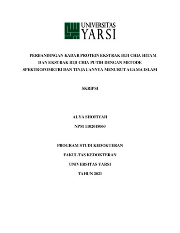 Shofiyah, Alya (2021) PERBANDINGAN KADAR PROTEIN EKSTRAK BIJI CHIA HITAM DAN EKSTRAK BIJI CHIA PUTIH DENGAN METODE SPEKTROFOMETRI DAN TINJAUANNYA MENURUT AGAMA ISLAM. Diploma thesis, Universitas YARSI.