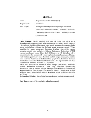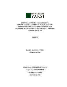 Fithri, Balqis Raddina (2021) HUBUNGAN ANTARA CYBERBULLYING DENGAN KESEHATAN MENTAL PADA MAHASISWA FAKULTAS KEDOKTERAN UNIVERSITAS YARSI ANGKATAN 2019 DAN 2020 DAN TINJAUANNYA MENURUT PANDANGAN ISLAM. Diploma thesis, Universitas YARSI.