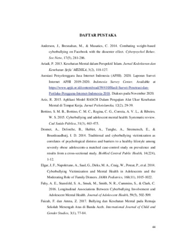 | Uncontrolled Keywords: | cyberbullying, mahasiswa, kesehatan mental. |