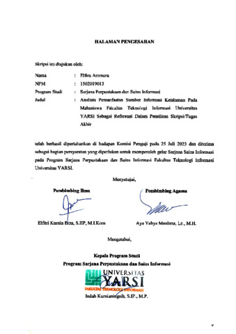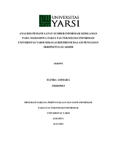 Ammara, Elfira (2023) ANALISIS PEMANFAATAN SUMBER INFORMASI KEISLAMAN PADA MAHASISWA FAKULTAS TEKNOLOGI INFORMASI UNIVERSITAS YARSI SEBAGAI REFERENSI DALAM PENULISAN SKRIPSI/TUGAS AKHIR. Diploma thesis, Universitas YARSI.