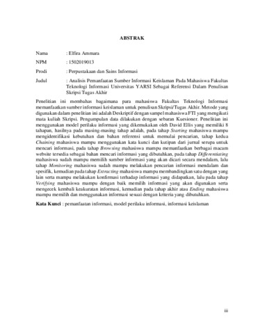 Penelitian ini membahas bagaimana para mahasiswa Fakultas Teknologi Informasi memanfaatkan sumber informasi keislaman untuk penulisan Skripsi/Tugas Akhir. Metode yang digunakan dalam penelitian ini adalah Deskriptif dengan sampel mahasiswa FTI yang mengikuti mata kuliah Skripsi. Pengumpulan data dilakukan dengan sebaran Kuesioner. Penelitian ini menggunakan model perilaku informasi yang dikemukakan oleh David Ellis yang memiliki 8 tahapan, hasilnya pada masing-masing tahap adalah, pada tahap Starting mahasiswa mampu mengidentifikasi kebutuhan dan bahan referensi untuk memulai pencarian, tahap kedua Chaining mahasiswa mampu menggunakan kata kunci dan kutipan dari jurnal serupa untuk mencari informasi, pada tahap Browsing mahasiswa mampu memanfaatkan berbagai macam website tersedia sebagai bahan mencari informasi yang dibutuhkan, pada tahap Differentiating mahasiswa sudah mampu memilih sumber informasi yang akan dicari secara mendalam, lalu tahap Monitoring mahasiswa sudah mampu melakukan pencarian informasi mendalam dan spesifik, kemudian pada tahap Extracting mahasiswa mampu membandingkan satu dengan yang lain serta mampu melakukan konfirmasi terhadap informasi yang didapatkan, lalu pada tahap Verifying mahasiswa mampu dengan baik memilih informasi yang akan digunakan serta mengecek kembali keakuratan informasi, kemudian pada tahap akhir atau Ending mahasiswa mampu memilih dan menggunakan informasi sesuai dengan kriteria yang dibutuhkan.