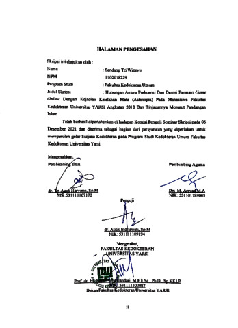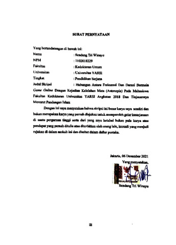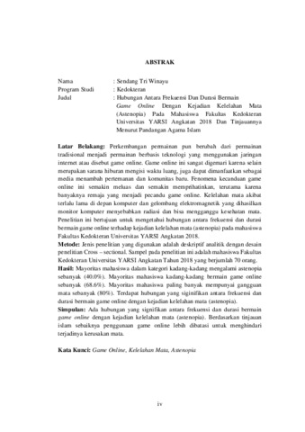 Winayu, Sendang Tri (2021) HUBUNGAN ANTARA FREKUENSI DAN DURASI BERMAIN GAME ONLINE DENGAN KEJADIAN KELELAHAN MATA (ASTENOPIA) PADA MAHASISWA FAKULTAS KEDOKTERAN UNIVERSITAS YARSI ANGKATAN 2018 DAN TINJAUANNYA MENURUT PANDANGAN ISLAM. Diploma thesis, Universitas YARSI.