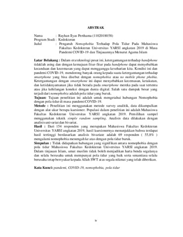 Perthama, Rayhan Ilyas (2021) PENGARUH NOMOPHOBIA TERHADAP POLA TIDUR PADA MAHASISWA FAKULTAS KEDOKTERAN UNIVERSITAS YARSI ANGKATAN 2019 DI MASA PANDEMI COVID-19 DAN TINJAUANNYA MENURUT PANDANGAN ISLAM. Diploma thesis, Universitas YARSI.