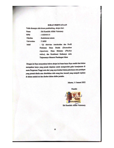 Valerianty, Siti Kamilah Afifah (2022) UJI AKTIVITAS ANTIOKSIDAN DAN PROFIL FITOKIMIA DAUN DUDUK (Desmodium triquetrum), DAUN BELUNTAS (Pluchea indica) DAN KOMBINASI KEDUANYA SERTA TINJAUNNYA MENURUT PANDANGAN ISLAM. Diploma thesis, Universitas YARSI.