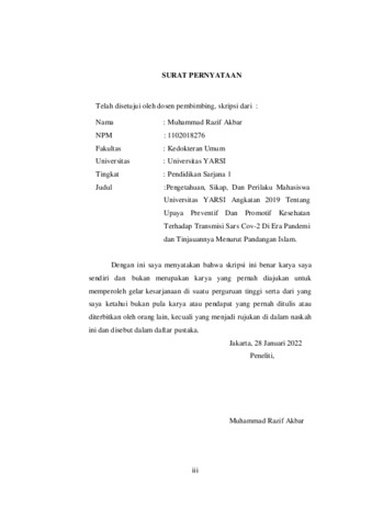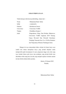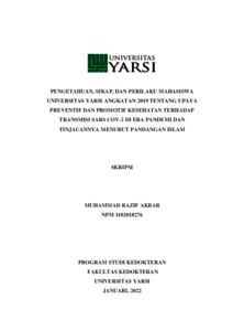 Akbar, Muhammad Razif (2022) Pengetahuan, Sikap, Dan Perilaku Mahasiswa Universitas Yarsi Angkatan 2019 Tentang Upaya Preventif Dan Promotif Kesehatan Terhadap Transmisi Sars Cov-2 Di Era Pandemi dan Tinjauannya Menurut Pandangan Islam. Diploma thesis, Universitas YARSI.