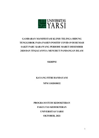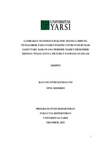 GAMBARAN MANIFESTASI KLINIS TELINGA HIDUNG TENGGOROK PADA PASIEN POSITIF COVID-19 DI RUMAH SAKIT PARU KARAWANG PERIODE MARET-DESEMBER TAHUN 2020 DAN TINJAUANNYA MENURUT PANDANGAN ISLAM Kayang Fitri Handayani1, Arroyan Wardhana2, Muhammad Arsyad3 1 Mahasiswa Fakultas Kedokteran Universitas YARSI 2 Staf pengajar bagian Pendidikan Kedokteran Fakultas Kedokteran Universitas YARSI 3 Staf pengajar bagian Agama Islam Fakultas Kedokteran Universitas YARSI ABSTRAK Latar Belakang : Pada Desember 2019 dunia dikejutkan dengan mewabahnya penyakit baru yang berasal dari Wuhan, Cina. Wabah ini kemudian menyebar dengan cepat ke lebih dari 190 negara. Wabah penyakit ini adalah jenis baru yang belum pernah diidentifikasi sebelumnya pada manusia. kemudian World Health Organization (WHO) mengumumkan nama baru pada 11 Februari 2020 yaitu Coronavirus Disease (COVID-19) yang disebabkan oleh virus Severe Acute Respiratory Syndrome Coronavirus-2 (SARS-CoV-2). Manifestasi klinis pada Covid-19 beragam, diantaranya terdapat manifestasi klinis yang berhubungan dengan Teliga Hidung Tenggorok seperti gangguan pengecapan, gangguan penghidu, batuk, pilek, dan sakit tenggorok. Tujuan penilitian ini adalah untuk mengetahui gambaran pasien positif Covid-19 dengan manifestasi klinis telinga hidung tenggorok di RS Paru Karawang periode Maret-Desembr 2020. Metode : Jenis penelitian yang di gunakan adalah deskriptif dengan rancangan penelitian cross sectional dan dengan metode purposive sampling. Penelitian ini dilakukan di RS Paru Karawang, kabupaten Karawang. Sampel dalam penelitian ini diambil dari data Rekam Medis pasien positif Covid-19 dengan manifestasi klinis THT berjumlah 110 orang. Hasil : Penelitian ini ditemukan bahwa pasien positif Covid-19 dengan manifefstasi klinis pada telinga hidung tenggorok di RS Paru Karawang berjumlah 110 orang, dengan jumlah jenis kelamin laki-laki 60 orang (55%), perempuan 50 orang (45%). Manifestasi klinis gangguan penghidu sebanyak 55 orang (50%), gangguan pengecap 4 orang (3,6%), batuk 32 orang (29%), pilek 16 orang (14,5%), sakit tenggorok 3 orang (2,72%). Kesimplan: Gambaran pasien positif Covid-19 dengan manifestasi klinis telinga hidung tenggorok di RS Paru karawang berjumlah 110 orang, manifestasi klinis telinga hidung tenggorok terbanyak pada gangguan penghidu berjumlah 55 orang (50%), dengan jenis kelamin perempuan sebanyak 38 orang (38%). Kata Kunci : Covid-19, Manifestasi Klinis Telinga Hidung Tengorok