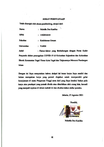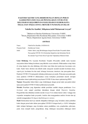 Kaulika, Nabella Des (2021) FAKTOR-FAKTOR YANG BERHUBUNGAN DENGAN PERAN KADER POSYANDU DALAM PENCEGAHAN COVID-19 DI KELURAHAN KEJAMBON DAN KELURAHAN SLEROK KECAMATAN TEGAL TIMUR KOTA TEGAL DAN TINJAUANNYA MENURUT PANDANGAN ISLAM. Diploma thesis, Universitas YARSI.