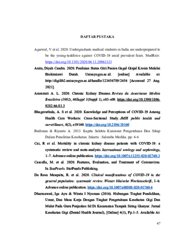 | Uncontrolled Keywords: | Pengetahuan, COVID-19, Penyakit Ginjal Kronis, Mahasiswa, Pandemi |