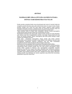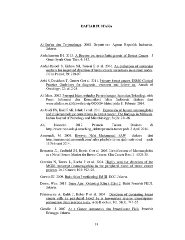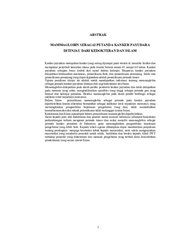 Kanker payudara merupakan kanker yang sering dijumpai pada wanita di Amerika Serikat dan merupakan penyebab kematian utama pada wanita berusia antara 45 sampai 64 tahun. Kanker payudara sebagian besar timbul dari epitel duktus kelenjar. Diagnosis kanker payudara ditegakkan berdasarkan anamnesis, pemeriksaan fisik, dan pemeriksaan penunjang. Salah satu pemeriksaan penunjang yang dapat digunakan adalah pemeriksaan petanda tumor. Tujuan penulisan skripsi ini adalah untuk mendapatkan informasi tentang mammaglobin sebagai petanda kanker payudara ditinjau dari segi kedokteran dan Islam. Mammaglobin didapatkan pada darah perifer penderita kanker payudara dan tidak didapatkan pada manusia yang sehat, mengindikasikan spesifitas yang tinggi sebagai petanda gen yang berasal dari kelenjar payudara. Deteksi mammaglobin pada darah perifer berfungsi sebagai indikator awal terjadinya metastasis. Dalam Islam pemeriksaan mammaglobin sebagai petanda pada kanker payudara diperbolehkan karena diketahui bermanfaat sebagai indikator awal terjadinya metastasis yang memungkinkan pengambilan keputusan pengobatan yang dini, tidak menimbulkan kemudharatan dan dari teknik pemeriksaan tidak melanggar syariat Islam. Kedokteran dan Islam sependapat bahwa pemeriksaan mammaglobin diperbolehkan. Saran kepada para ahli kedokteran dan peneliti untuk mencari informasi sebanyak-banyaknya perkembangan terbaru mengenai petanda tumor dan mulai meneliti mammaglobin sebagai petanda kanker payudara di Indonesia guna memungkinkan pengambilan keputusan pengobatan yang lebih baik. Kepada tokoh agama diharapkan dapat memberikan penjelasan tentang pentingnya menjaga kesehatan tubuh kepada masyarakat, serta selalu menganjurkan masyarakat yang menderita penyakit untuk selalu berikhtiar dan berdoa kepada Allah SWT terhadap penyakit yang dideritanya dan mencari pengobatan yang terbaik demi kesembuhan penderitanya yang sesuai syariat Islam.