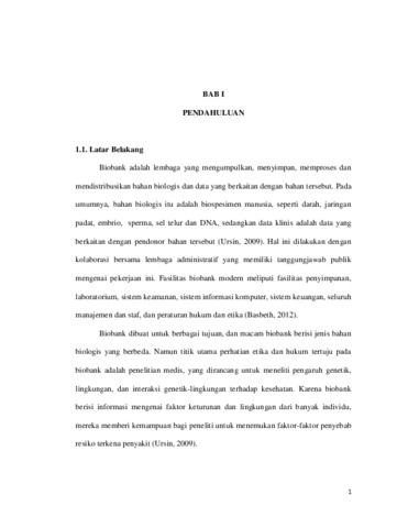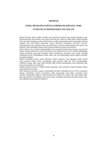 Dalam beberapa tahun terakhir biobank telah didirikan diseluruh dunia untuk memantau status kesehatan pasien atau pendonor atau objek penelitian dari waktu ke waktu untuk menilai kejadian alam dan perkembangan penyakit. Oleh karena itu tidak mengherankan untuk mempelajari tentang masalah etika dan hukum tradisional, seperti Informasi persetujuan (Informed Consent), perlindungan privasi, keamanan data, non-diskriminasi, otonomi dan penentuan nasib pasien atau pendonor telah menduduki tempat sentral dalam perdebatan regulasi pada biobank. Dalam konteks luas, biobank mengumpulkan dan menyimpan bahan-bahan biologis yang disertai dengan bebagai jumlah data medis, demografis, dan epidemiologi. Saat ini biobank dihubungkan dengan penelitian tetapi juga berfungsi untuk memfasilitasi penelitian masa depan. Biobank merupakan proyek berkelanjutan dimana bahan dan data dikumpulkan dalam jangka prospektif dan jangka panjang. Dalam masyarakat muslim sudah seharusnya standar normative yang digunkan adalah syariah islam (menurut hukum Islam). Barangsiapa yang memiliki maka dia behak memanfaatkan, sebaliknya barang siapa yang tidak memiliki tidak berhak memanfaatkan yang didasarkan pada konsep kepemilikan (al-milkiyyah). Tujuan penulisan skripsi ini adalah untuk mengetahui etika penelitian dengan Biobank ditinjau dari kedokteran dan Islam. Pada dasaranya penelitian dengan mengunnakan Biobank dihalalkan karena bersifat mengobati dengan memberikan peneliti kesempatan untuk menemukan factor-faktor penyebab resiko penyakit, menentukan diagnosis suatu penyakit atau bahkan obat. Hanya saja tentu terdapat hak- hak yang dimiliki oleh pendonor atau pasien dalam melakukan penelitian dan tidak adanya unsur keterpaksaan atau penipuan di dalamnya.