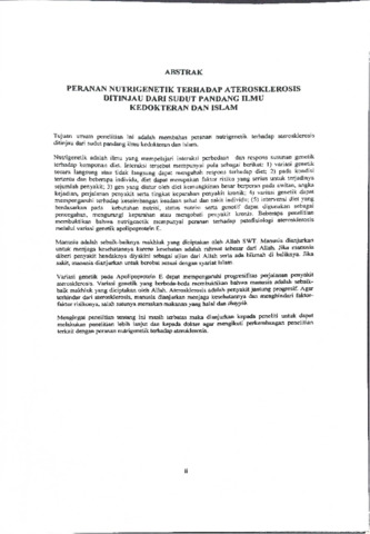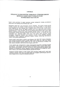 Tujuan umum penelitian ini adalah membahas peranan nutrigenetik terhadap aterosklerosis ditinjau dari sudut pandang ilmu kedokteran dan islam. Nutrigenetik adalah ilmu yang mempelajari interaksi perbedaan dan respons susunan genetik terhadap komponan diet. Interaksi tersebut mempunyai pola sebagai berikut: 1) variasi genetik secara langsung atau tidak langsung dapat mengubah respons terhadap diet; 2) pada kondisi tertentu dan beberapa individu, diet dapat merupakan faktor risiko yang serius untuk terjadinya sejumlah penyakit; 3) gen yang diatur oleh diet kemungkinan besar berperan pada awitan, angka kejadian, perjalanan penyakit serta tingkat keparahan penyakit kronik; 4) variasi genetik dapat mempengaruhi terhadap keseimbangan keadaan sehat dan sakit individu; (5) intervensi diet yang berdasarkan pada kebutuhan nutrisi, status nutrisi serta genotif dapat digunakan sebagai pencegahan, mengurangi keparahan atau mengobati penyakit kronis. Beberapa penelitian membuktikan bahwa nutrigenetik mempunyai peranan terhadap patofisiologi aterosklerosis melalui variasi genetik apolipoprotein E. Manusia adalah sebaik-baiknya makhluk yang diciptakan oleh Allah SWT. Manusia dianjurkan untuk menjaga kesehatannya karena kesehatan adalah rahmat tebesar dari Allah. Jika manusia diberi penyakit hendaknya diyakini sebagai ujian dari Allah serta ada hikmah di baliknya. Jika sakit, manusia dianjurkan untuk berobat sesuai dengan syariat Islam. Variasi genetik pada Apolipoprotein E dapat mempengaruhi progresifitas perjalanan penyakit aterosklerosis. Variasi genetik yang berbeda-beda membuktikan bahwa manusia adalah sebaik- baik makhluk yang diciptakan oleh Allah. Aterosklerosis adalah penyakit jantung progresif. Agar terhindar dari aterosklerosis, manusia dianjurkan menjaga kesehatannya dan menghindari faktor- faktor risikonya, salah satunya memakan makanan yang halal dan thayyib. Mengingat penelitian tentang ini masih terbatas maka dianjurkan kepada peneliti untuk dapat melakukan penelitian lebih lanjut dan kepada dokter agar mengikuti perkembangan penelitian terkait dengan peranan nutrigenetik terhadap ateroklerosis.