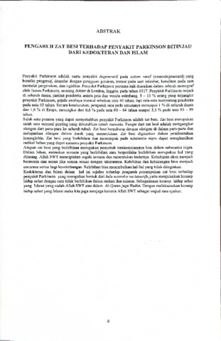 Penyakit Parkinson adalah suatu penyakit degeneratif pada sistem saraf (neurodegeneratif) yang bersifat progresif, ditandai dengan gangguan gerakan, tremor pada saat istirahat, kesulitan pada saat memulai pergerakan, dan rigiditas. Penyakit Parkinson pertama kali diuraikan dalam sebuah monograf oleh James Parkinson, seorang dokter di London, Inggris, pada tahun 1817. Penyakit Parkinson terjadi di seluruh dunia, jumlah penderita antara pria dan wanita seimbang. 5 10% orang yang terjangkit penyakit Parkinson, gejala awalnya muncul sebelum usia 40 tahun, tapi rata-rata menyerang penderita pada usia 65 tahun. Secara keseluruhan, pengaruh usia pada umumnya mencapai 1 % di seluruh dunia dan 1,6 % di Eropa, meningkat dari 0,6 % pada usia 60-64 tahun sampai 3,5 % pada usia 85 - 89 tahun. - Salah satu pemicu yang dapat menyebabkan penyakit Parkinson adalah zat besi. Zat besi merupakan salah satu mineral penting yang dibutuhkan tubuh manusia. Fungsi dari zat besi adalah mengangkut oksigen dari paru-paru ke seluruh tubuh. Zat besi bergabung dengan oksigen di dalam paru-paru dan melepaskan oksigen dalam darah yang memerlukan. Zat besi digunakan dalam pembentukan hemoglobin. Zat besi yang berlebihan dan menumpuk pada substantia nigra dapat menghasilkan radikal bebas yang dapat memicu penyakit Parkinson Asupan zat besi yang berlebihan merupakan penyebab terakumulasinya besi dalam substantia nigra. Dalam Islam, memakan sesuatu yang berlebihan atau berperilaku berlebihan merupakan hal yang dilarang. Allah SWT menciptakan segala sesuatu dan menentukan kadarnya. Kehidupan akan menjadi harmonis dan serasi jika semua sesuai dengan takarannya. Kelebihan dan kekurangan bisa menjadi ancaman serius bagi keseimbangan. Kelebihan bisa menimbulkan hal-hal yang tidak diinginkan. Kedokteran dan Islam dalam hal ini sejalan terhadap pengaruh penumpukan zat besi terhadap penyakit Parkinson yang merupakan bentuk dari kulu wasrobu wa latusrifu, yaitu menjalankan konsep hidup sehat dengan cara tidak berlebihan dalam makan dan minum. Sebagaimana konsep hidup sehat yang Islami yang sudah Allah SWT atur dalam Al-Quran juga Hadist. Dengan melaksanakan konsep hidup sehat yang Islami maka kita juga menjaga karunia Allah SWT sebagai wujud rasa syukur.