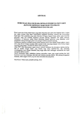 Polusi suara atau bising adalah bunyi yang tidak diinginkan dari usaha atau kegiatan dalam tingkat dan waktu tertentu yang dapat menimbulkan gangguan kesehatan manusia dan kenyamanan lingkungan. Dari penelitian yang telah dilakukan di negara bagian Eropa, polusi suara memiliki hubungan yang erat terhadap terjadinya penyakit jantung, hipertensi dan infark miokard. Sedangkan, di Indonesia sendiri belum ditemukan adanya penelitian yang dilakukan untuk mengetahui adanya hubungan polusi suara dengan insidensi penyakit jantung.Mekanisme terjadinya penyakit jantung akibat paparan polusi suara adalah dengan adanya respon stres yang diawali dengan perasaan tidak nyaman ketika seseorang terpapar suara bising dengan intensitas yang tinggi (>80 dB) dan dalam waktu yang lama.Allah SWT telah menciptakan segala sesuatu menurut ketentuan dan ukurannya masing-masing. Hal ini disebut dengan Qadar yang berlaku bagi setiap makhluk-Nya. Jika seseorang mendengarkan suara dengan intensitas yang tinggi maka telah melanggar sunnatullah dan dapat merugikan dirinya sendiri.Dalam pandangan Islam, kedudukan jantung merupakan organ yang sangat penting dan baik buruknya seseorang ditentukan oleh baik atau tidaknya jantung (kalbu). Jika jantung mengalami kelainan, maka anggota tubuh yang lain akan merasakan hal yang sama.