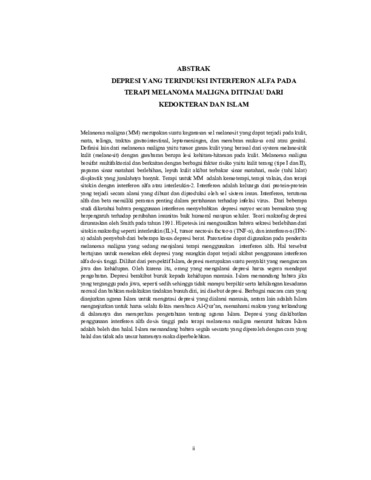 Melanoma maligna (MM) merupakan suatu keganasan sel melanosit yang dapat terjadi pada kulit, mata, telinga, traktus gastrointestinal, leptomeningen, dan membran mukosa oral atau genital. Definisi lain dari melanoma maligna yaitu tumor ganas kulit yang berasal dari system melanositik kulit (melanosit) dengan gambaran berupa lesi kehitam-hitaman pada kulit. Melanoma maligna bersifat multifaktorial dan berkaitan dengan berbagai faktor risiko yaitu kulit terang (tipe I dan II), paparan sinar matahari berlebihan, lepuh kulit akibat terbakar sinar matahari, mole (tahi lalat) displastik yang jumlahnya banyak. Terapi untuk MM adalah kemoterapi, terapi vaksin, dan terapi sitokin dengan interferon alfa atau interleukin-2. Interferon adalah keluarga dari protein-protein yang terjadi secara alami yang dibuat dan diproduksi oleh sel sistem imun. Interferon, terutama alfa dan beta memiliki peranan penting dalam pertahanan terhadap infeksi virus. Dari beberapa studi diketahui bahwa penggunaan interferon menyebabkan depresi mayor secara bermakna yang berpengaruh terhadap perubahan imunitas baik humoral maupun seluler. Teori makrofag depresi dirumuskan oleh Smith pada tahun 1991. Hipotesis ini mengusulkan bahwa sekresi berlebihan dari sitokin makrofag seperti interleukin (IL)-I, tumor necrosis factor-a (TNF-a), dan interferon-a (IFN- a) adalah penyebab dari beberapa kasus depresi berat. Paroxetine dapat digunakan pada penderita melanoma maligna yang sedang menjalani terapi menggunakan interferon alfa. Hal tersebut bertujuan untuk menekan efek depresi yang mungkin dapat terjadi akibat penggunaan interferon alfa dosis tinggi. Dilihat dari perspektif Islam, depresi merupakan suatu penyakit yang mengancam jiwa dan kehidupan. Oleh karena itu, orang yang mengalami depresi harus segera mendapat pengobatan. Depresi berakibat buruk kepada kehidupan manusia. Islam memandang bahwa jika yang terganggu pada jiwa, seperti sedih sehingga tidak mampu berpikir serta kehilangan kesadaran normal dan bahkan melakukan tindakan bunuh diri, ini disebut depresi. Berbagai macam cara yang dianjurkan agama Islam untuk mengatasi depresi yang dialami manusia, antara lain adalah Islam menganjurkan untuk harus selalu fokus membaca Al-Qur’an, memahami makna yang terkandung di dalamnya dan memperluas pengetahuan tentang agama Islam. Depresi yang diakibatkan penggunaan interferon alfa dosis tinggi pada terapi melanoma maligna menurut hukum Islam adalah boleh dan halal. Islam memandang bahwa segala sesuatu yang diperoleh dengan cara yang halal dan tidak ada unsur haramnya maka diperbolehkan.