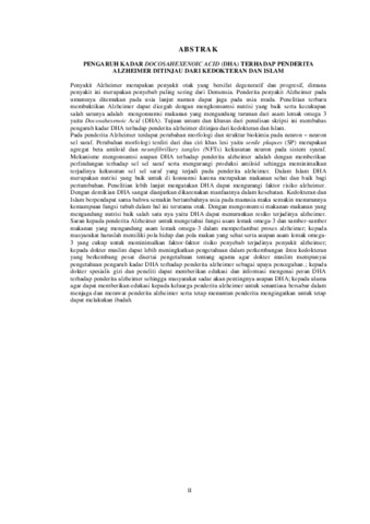 Penyakit Alzheimer merupakan penyakit otak yang bersifat degeneratif dan progresif, dimana penyakit ini merupakan penyebab paling sering dari Demensia. Penderita penyakit Alzheimer pada umumnya ditemukan pada usia lanjut namun dapat juga pada usia muda. Penelitian terbaru membuktikan Alzheimer dapat dicegah dengan mengkonsumsi nutrisi yang baik serta kecukupan salah satunya adalah mengonsumsi makanan yang mengandung turunan dari asam lemak omega 3 yaitu Docosahexenoic Acid (DHA). Tujuan umum dan khusus dari penulisan skripsi ini membahas pengaruh kadar DHA terhadap penderita alzheimer ditinjau dari kedokteran dan Islam. Pada penderita Alzheimer terdapat perubahan morfologi dan struktur biokimia pada neuron – neuron sel saraf. Perubahan morfologi terdiri dari dua ciri khas lesi yaitu senile plaques (SP) merupakan agregat beta amiloid dan neurofibrillary tangles (NFTs) kekusutan neuron pada sistem syaraf. Mekanisme mengonsumsi asupan DHA terhadap penderita alzheimer adalah dengan memberikan perlindungan terhadap sel sel saraf serta mengurangi produksi amiloid sehingga meminimalkan terjadinya kekusutan sel sel saraf yang terjadi pada penderita alzheimer. Dalam Islam DHA merupakan nutrisi yang baik untuk di konsumsi karena merupakan makanan sehat dan baik bagi pertumbuhan. Penelitian lebih lanjut mengatakan DHA dapat mengurangi faktor risiko alzheimer. Dengan demikian DHA sangat dianjurkan dikarenakan manfaatnya dalam kesehatan. Kedokteran dan Islam berpendapat sama bahwa semakin bertambahnya usia pada manusia maka semakin menurunnya kemampuan fungsi tubuh dalam hal ini terutama otak. Dengan mengonsumsi makanan-makanan yang mengandung nutrisi baik salah satu nya yaitu DHA dapat menurunkan resiko terjadinya alzheimer. Saran kepada penderita Alzheimer untuk mengetahui fungsi asam lemak omega-3 dan sumber-sumber makanan yang mengandung asam lemak omega-3 dalam memperlambat proses alzheimer; kepada masyarakat haruslah memiliki pola hidup dan pola makan yang sehat serta asupan asam lemak omega3 yang cukup untuk meminimalkan faktor-faktor risiko penyebab terjadinya penyakit alzheimer; kepada dokter muslim dapat lebih meningkatkan pengetahuan dalam perkembangan ilmu kedokteran yang berkembang pesat disertai pengetahuan tentang agama agar dokter muslim mempunyai pengetahuan pengaruh kadar DHA terhadap penderita alzheimer sebagai upaya pencegahan.; kepada dokter spesialis gizi dan peneliti dapat memberikan edukasi dan informasi mengenai peran DHA terhadap penderita alzheimer sehingga masyarakat sadar akan pentingnya asupan DHA; kepada ulama agar dapat memberikan edukasi kepada keluarga penderita alzheimer untuk senantiasa bersabar dalam menjaga dan merawat penderita alzheimer serta tetap menuntun penderita mengingatkan untuk tetap dapat melakukan ibadah.