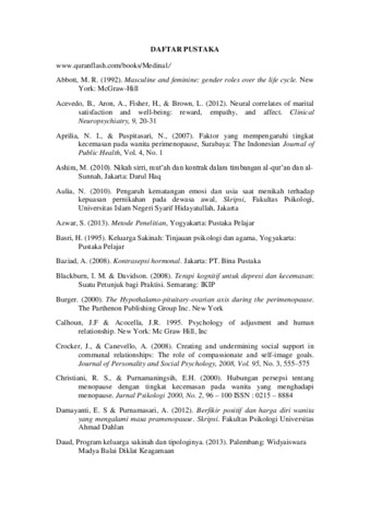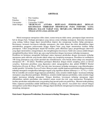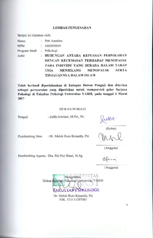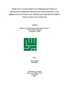 Amalina, Puti (2017) HUBUNGAN ANTARA KEPUASAN PERNIKAHAN DENGAN KECEMASAN TERHADAP MENOPAUSE PADA INDIVIDU YANG BERADA DALAM TAHAP USIA MENJELANG MENOPAUSE SERTA TINJAUANNYA DALAM ISLAM. Diploma thesis, Universitas YARSI.