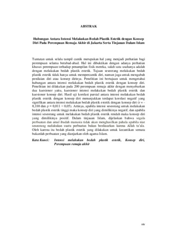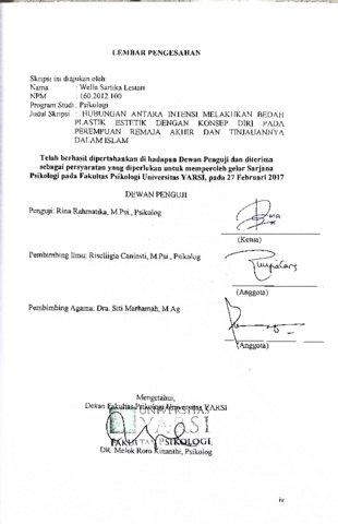 Lestari, Wella Sartika (2017) HUBUNGAN ANTARA INTENSI MELAKUKAN BEDAH PLASTIK ESTETIK DENGAN KONSEP DIRI PADA PEREMPUAN REMAJA AKHIR DI JAKARTA SERTA TINJAUANNYA DALAM ISLAM. Diploma thesis, Universitas YARSI.