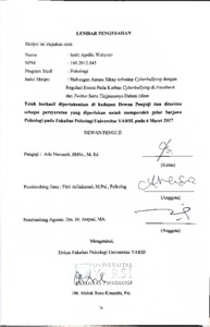 | Uncontrolled Keywords: | Cyberbullying, Facebook ̧ Twitter, Sikap, Regulasi emosi, Korban Cyberbullying. |