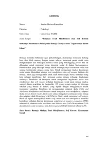 Remaja memiliki beberapa tugas perkembangan, diantaranya mencapai hubungan baru dan lebih matang dengan teman sebaya, mencapai peran sosial serta mengharapkan dan mencapai perilaku sosial yang bertanggung jawab. Hal ini dilakukan untuk mencapai peran interaksi sosial di dalam lingkungannya. Permasalahan yang dihadapi remaja adalah meningkatnya kecemasan sosial saat sedang berinteraksi dengan orang lain. Untuk mengurangi tingkat kecemasan sosial maka dibutuhkan adanya trait mindfulness dan self esteem didalam diri remaja. Islam juga mengajarkan untuk tidak berprasangka buruk terhadap orang lain sebagai manifestasi dari perasaan cemas remaja terhadap lingkungan sosialnya. Penelitian ini bertujuan untuk mengetahui bagaimana peran trait mindfulness dan self esteem terhadap kecemasan sosial pada remaja madya. sampel dalam penelitian ini berjumlah 155 orang remaja madya di beberapa sekolah yang berada di Bekasi, yang dipilih dengan menggunakan teknik incedental sampling. Penelitian ini menggunakan adaptasi skala Child and Adolscent Mindfulness and Measure untuk mengukur trait mindfulness, adaptasi skala Social Anxiety Scale-Adolescents untuk mengukur kecemasan sosial remaja dan adaptasi skala Rosenberg’s Self Esteem Scale untuk mengukur self esteem. Hasil uji regresi menunjukkan bahwa self esteem dan trait mindfulness memiliki kontribusi terhadap dimensi kecemasan sosial fear of negative evaluation (FNE) sebesar 8%, dimensi social avoidance and distress new (SAD-New) sebesar 2,8%.