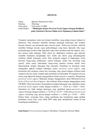 Putri, Marizka Fitiriana Dwi (2016) HUBUNGAN ANTARA PERCEIVED SOCIAL SUPPORT DENGAN RESILIENSI PADA TUNANETRA DEWASA MUDA SERTA TINJAUANNYA DALAM ISLAM. Diploma thesis, Universitas YARSI.