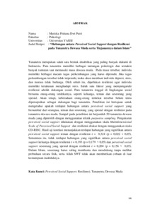 Tunanetra merupakan salah satu bentuk disabilitas yang paling banyak dialami di Indonesia. Para tunanetra memiliki berbagai tantangan psikologis dan semakin banyak tuntutan saat memasuki masa dewasa muda. Pada masa tersebut, individu memiliki berbagai macam tugas perkembangan yang harus dipenuhi. Jika tugas perkembangan tersebut tidak terpenuhi, maka akan membuat individu depresi, stres, dan merasa tidak berharga. Oleh sebab itu, diperlukan resiliensi agar individu memiliki ketahanan menghadapi stres. Salah satu faktor yang mempengaruhi resiliensi adalah dukungan sosial. Para tunanetra tinggal di lingkungan sosial bersama orang-orang terdekatnya, seperti keluarga, teman dan seseorang yang spesial. Akan tetapi, keberadaan orang-orang terdekat tersebut belum tentu dipersepsikan sebagai dukungan bagi tunanetra. Penelitian ini bertujuan untuk mengetahui apakah terdapat hubungan antara perceived social support yang bersumber dari orangtua, teman dan seseorang yang spesial dengan resiliensi pada tunanetra dewasa muda. Sampel pada penelitian ini berjumlah 50 tunanetra dewasa muda yang diperoleh dengan menggunakan teknik purposive sampling. Pengukuran perceived social support dilakukan dengan menggunakan skala Multidimensional Scale of Perceived Social Support dan resiliensi diukur dengan menggunakan skala CD-RISC. Hasil uji korelasi menunjukkan terdapat hubungan yang signifikan antara perceived social support teman dengan resiliensi r = 0,324 (p = 0,022 < 0,05). Sementara itu, tidak terdapat hubungan yang signifikan antara perceived social support keluarga dengan resiliensi r = 0,193 (p = 0,179 > 0,05) dan perceived social support seseorang yang spesial dengan resiliensi r = 0,204 (p = 0,156 > 0,05). Dalam Islam, seseorang harus saling membantu dan mendukung tanpa melihat perbedaan secara fisik, serta Allah SWT tidak akan memberikan cobaan di luar kemampuan makhluknya.