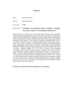 Sari, Raysita Nilam (2016) HUBUNGAN GAYA KELEKATAN DENGAN SELF-EFFICACY AKADEMIK SISWA SMA DI JAKARTA SERTA TINJAUANNYA DALAM ISLAM. Diploma thesis, Universitas YARSI.