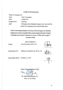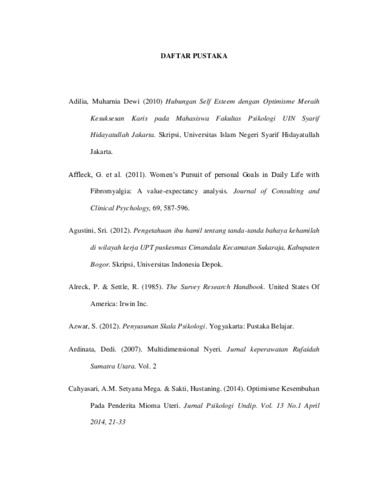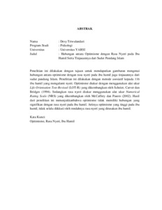 Penelitian ini dilakukan dengan tujuan untuk mendapatkan gambaran mengenai hubungan antara optimisme dengan rasa nyeri pada ibu hamil juga tinjauannya dari sudut pandang Islam. Penelitian ini dilakukan dengan metode asosiatif kepada 116 ibu hamil yang mengalami nyeri. Optimisme diukur dengan menggunakan alat ukur Life Orientation Test-Revised (LOT-R) yang dikembangkan oleh Scheier, Carver dan Bridges (1994). Sedangkan rasa nyeri diukur menggunakan alat ukur Numerical Rating Scale (NRS) yang dikembangkan oleh McCaffery dan Pasero (2002). Hasil dari penelitian ini menunjukkanbahwa optimisme tidak memiliki hubungan yang signifikan dengan rasa nyeri pada ibu hamil. Artinya optimisme yang tinggi pada ibu hamil, tidak selalu diikkuti oleh rendahnya rasa nyeri yang dirasakan ibu hamil.
