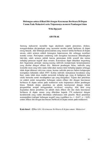 Djayanti, Wifa (2014) HUBUNGAN ANTARA EFIKASI DIRI DENGAN KECEMASAN BERBICARA DI DEPAN UMUM PADA MAHASISWI SERTA TINJAUANNYA DALAM PANDANGAN ISLAM. Diploma thesis, Universitas YARSI.