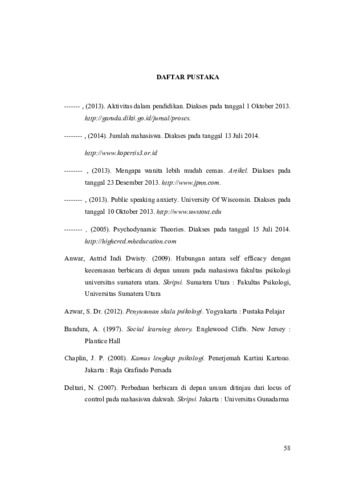 Seorang mahasiswi memiliki tugas akademik seperti presentasi, diskusi, mengemukakan ide/pendapat yang menuntut mereka untuk berbicara di depan orang banyak. Ada beberapa permasalahan yang muncul ketika berbicara di depan umum, salah satunya adalah kurangnya kepercayaan diri sehingga membuat mereka cemas. Perempuan cenderung sulit mengatasi kecemasan dibandingkan laki-laki, salah satunya adalah karena perempuan lebih sensitif dan rentan terhadap perasaan negatif akan sesuatu. Kecemasan dapat dikaitkan tergantung dari bagaimana persepsi masing-masing individu mempersepsi kemampuannya yang disebut dengan efikasi diri. Menurut pandangan Islam, individu yang memiliki iman yang tulus maka tidak akan merasa takut terhadap apapun sehingga tidak dapat dikuasai oleh rasa cemas, karena individu percaya bahwa kelapangan merupakan kehendak Allah SWT. Ketika individu mempunyai keyakinan yang kuat, maka tidak akan mudah menyerah terhadap apa yang di hadapinya dan selalu berusaha untuk mendapatkan apa yang diinginkan. Tujuan dari penelitian ini adalah untuk mengetahui hubungan antara efikasi diri dengan kecemasan berbicara di depan umum pada mahasiswi serta tinjauannya dalam pandangan Islam. Metode dalam penelitian ini adalah korelasional dengan teknik pengambilan sampel menggunakan incidental sampling. Alat ukur yang digunakan dalam penelitian ini adalah skala efikasi diri dan skala kecemasan berbicara di depan umum yang diberikan kepada 270 mahasiswi dengan karakteristik yang sudah ditentukan sebelumnya oleh peneliti. Hasil penelitian menunjukkan terdapat hubungan negatif yang signifikan (rxy = -0,637, ρ < 0,05) antara efikasi diri dengan kecemasan berbicara di depan umum pada mahasiswi.