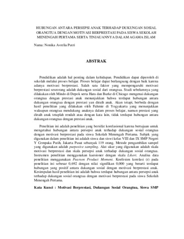 Putri, Nonika Avrelia (2013) HUBUNGAN ANTARA PERSEPSI ANAK TERHADAP DUKUNGAN SOSIAL ORANGTUA DENGAN MOTIVASI BERPRESTASI PADA SISWA SEKOLAH MENENGAH PERTAMA SERTA TINJAUANNYA DALAM AGAMA ISLAM. Diploma thesis, Universitas YARSI.